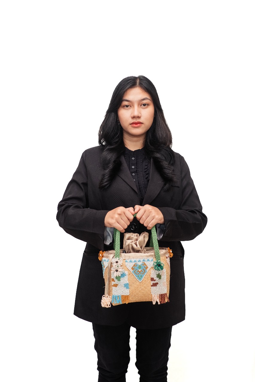 Crafted from woven rattan combined with beadwork, featuring traditional Dayak motifs intertwined with modern color designs.