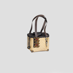 Material Type: Wicker rattan, Woven beads, Cotton fabric with abstract print, synthetic leather strap