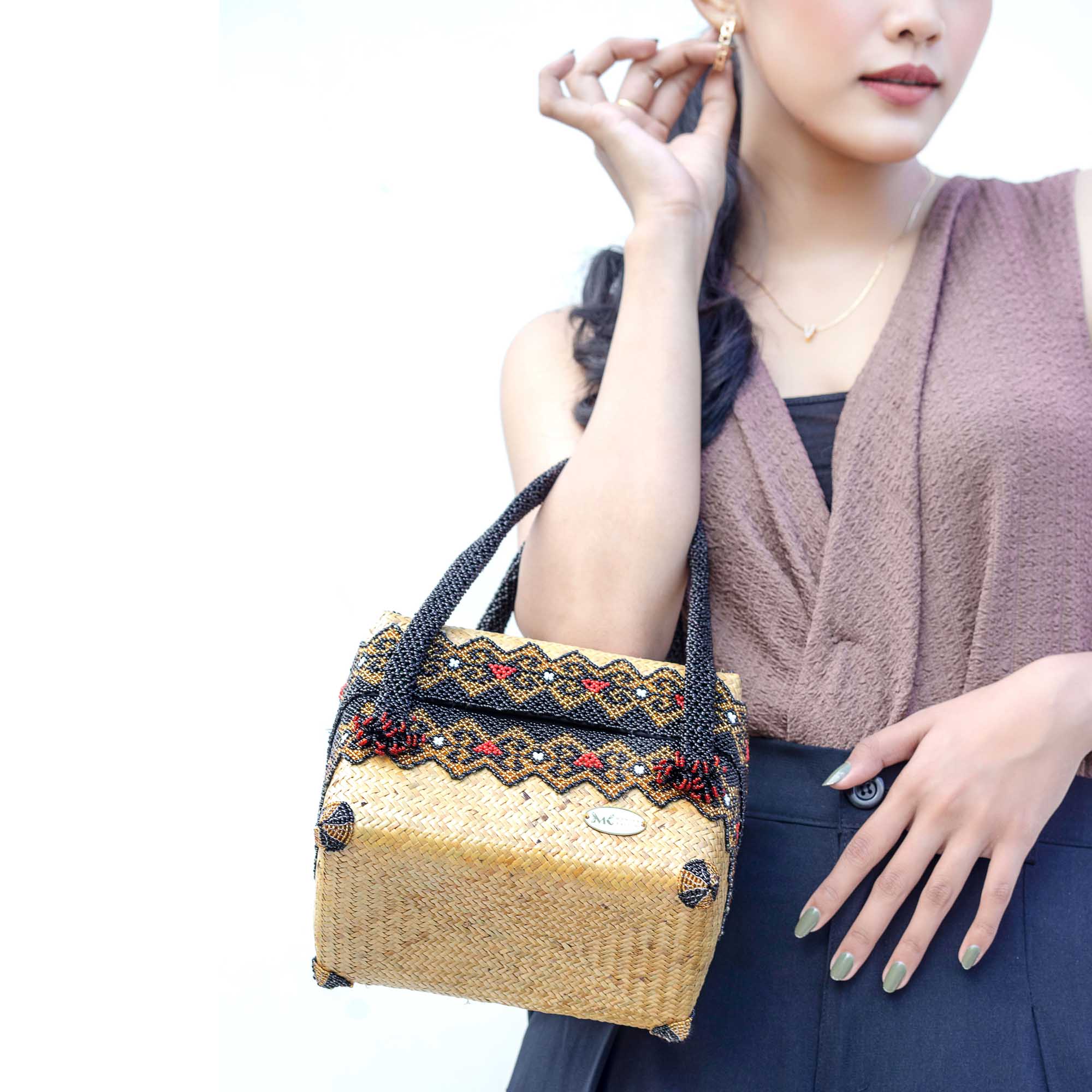 Jenis Motif: Dayak Bahau Nama Motif : Kalung Lamah ( alam semesta ) dan kombinasi anyaman rotan Filosofi : Kalung Lamah adalah motif alam semesta yaitu simbol dari flora di bumi. Motif ini biasa di pakai masyarakat umum. Anyaman tas rotan ini dulu biasa di pakai untuk tempat perlengkapan nyirih (tempat sirih ).