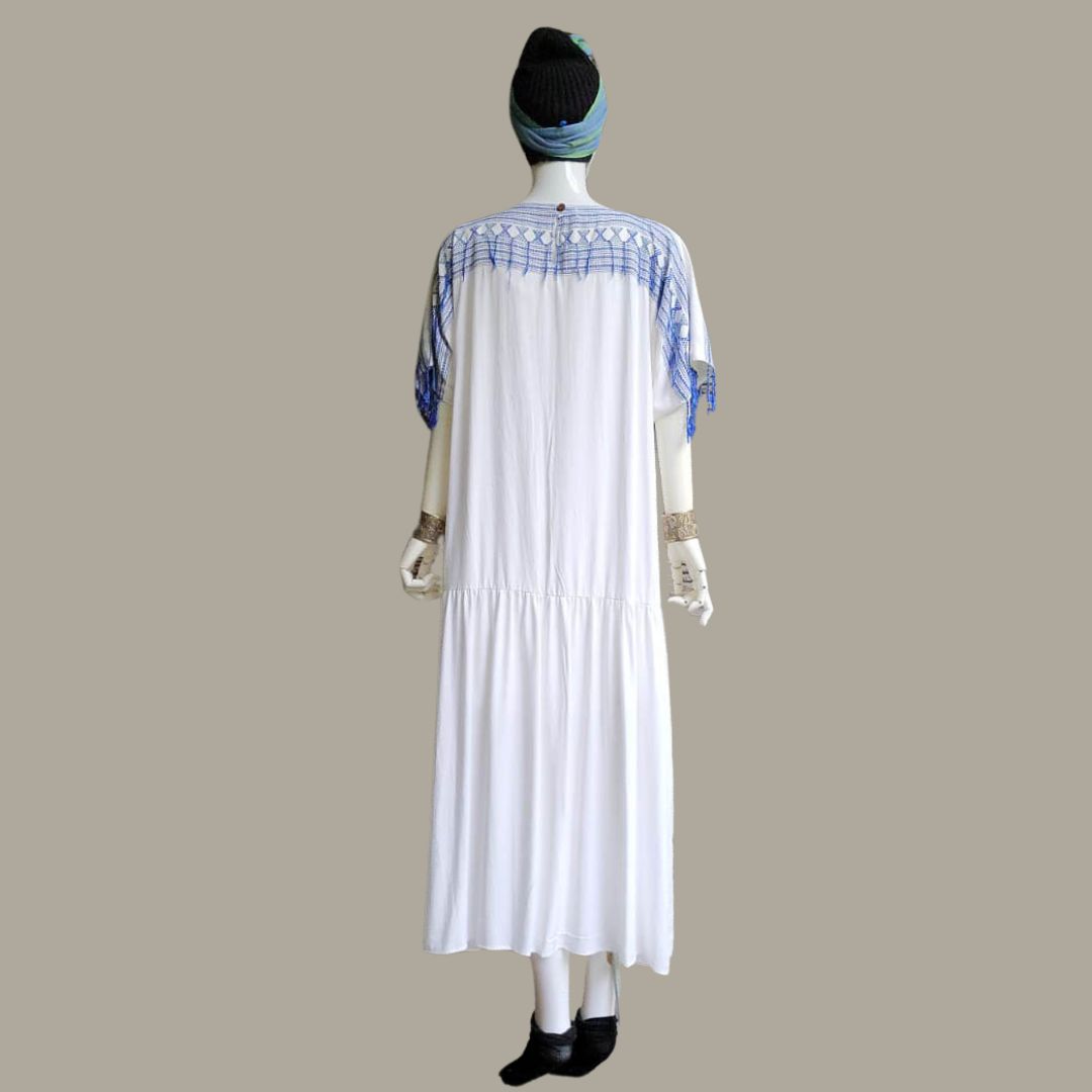 Size: A maxi dress with ruffles on the 1/3 of the lower part Oversize Dress in Baduy Adu Mancung (Point to Point) embroidery on shoulder ruffles Material Cotton Rayon Size : Free/All Size Code : RYAM Sabri D All embroideries are handwoven from Baduy tribe pattern