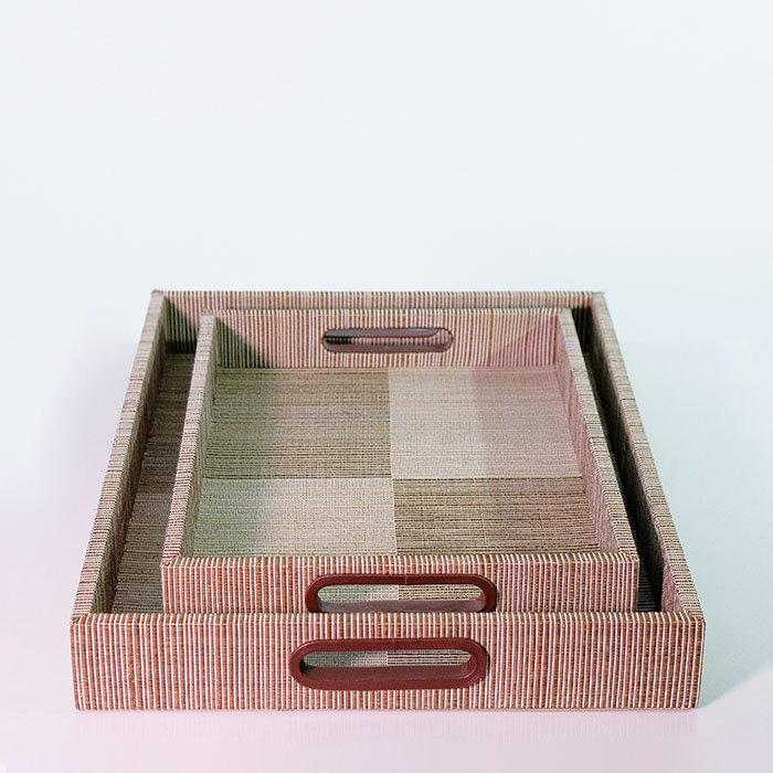 Produk terbuat dari material tenun mendong ang kemudian di rangkai ke dalam bingkai nampan untuk menambah tekstur dan warna natural yang dapat berfungsi sebagai nampan fungsional maupun sebagai dekorasi.