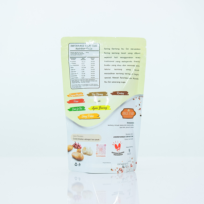 Kering Kentang Mustofa Ibu Emi is a snack made from selected potatoes and natural spice seasonings, making it the only crispy and long-lasting Potato Crisps with a variety of flavors.