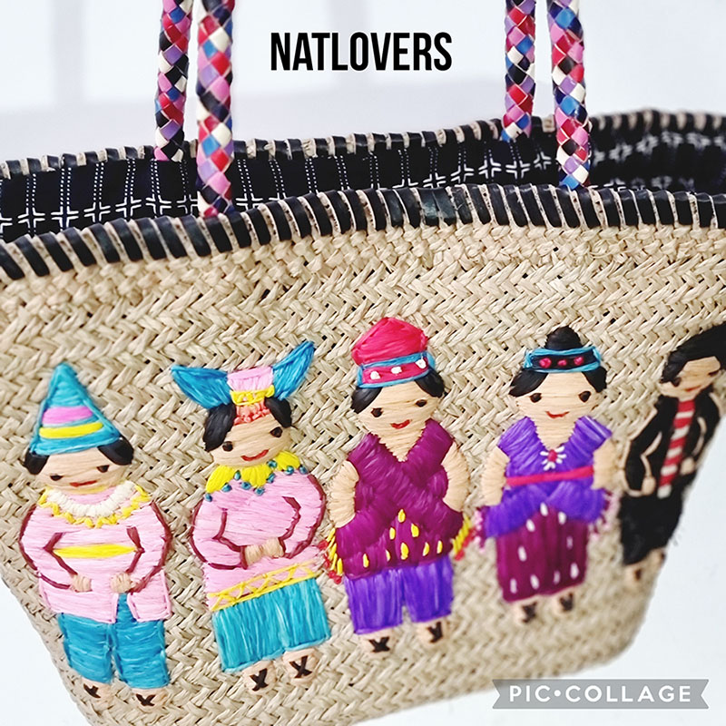 Material Type: mendong (Fimbristylis umbellaris). Handle : kulit nabati (vegetable leather) Embroidery work (bahan sulam) : raffia fibre (serat gajih) with synthetic dyes