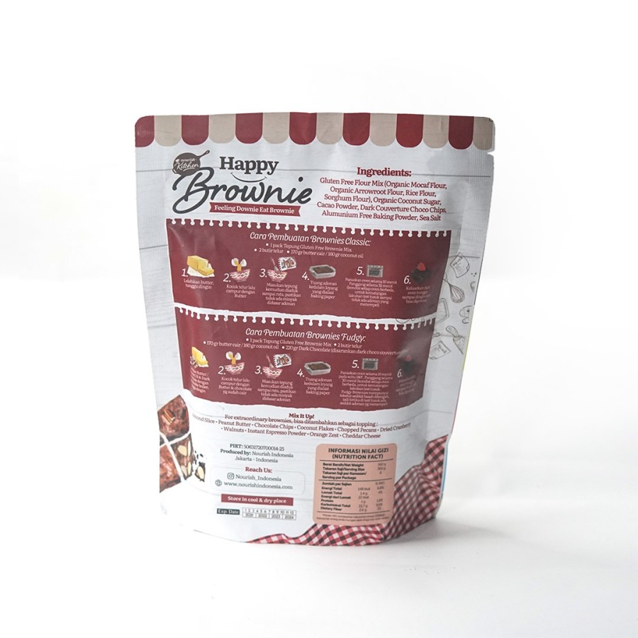 Happy Brownie Gluten-Free Brownies Mix easy to make only add egg, butter/coconut oil and dark chocolate 600% for making a fudgy brownie.