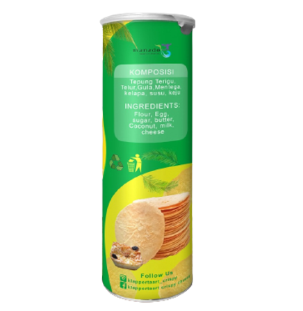 Klappertaart is known as a wet typical Manado processed cake, now it is being innovated to be dry and crispy. Since 2019, the first Crispy Cheese Klappertaart appeared in Manado, North Sulawesi by N'Poppy Cake & Dessert.