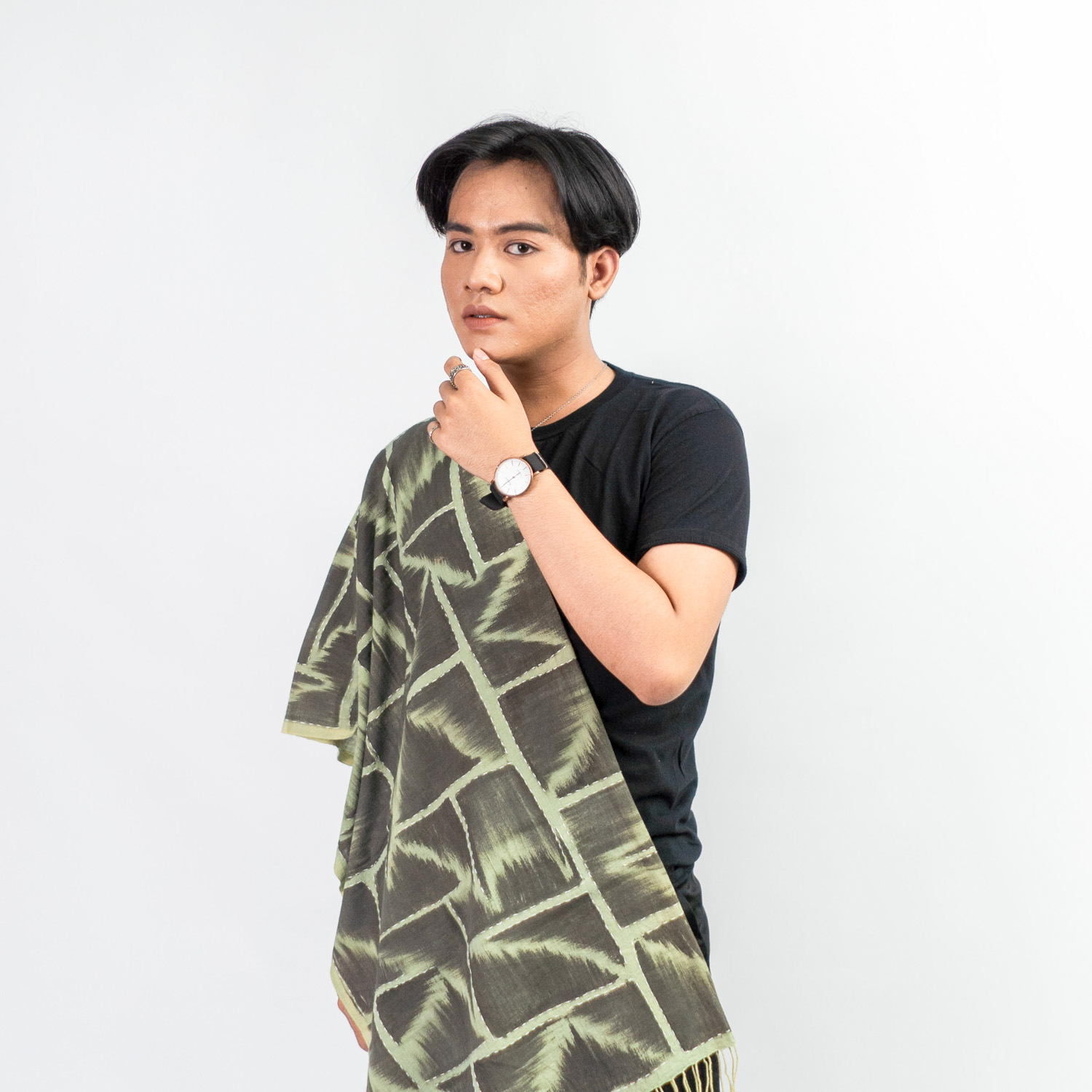 Pattern Meaning: Painted scarf ini dibuat dengan teknik lukis menggunakan tinta warna alam, dan motifnya terinspirasi dari Bedeg atau anyaman bambu yang biasa digunakan untuk dinding rumah orang Bali.
