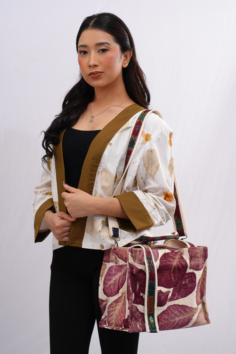 A handbag with a fairly large size, made from canvas with a teak leaf motif and Palembang textile accents, namely woven blanks on the handle, make this bag very unique and beautiful