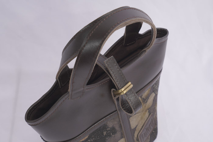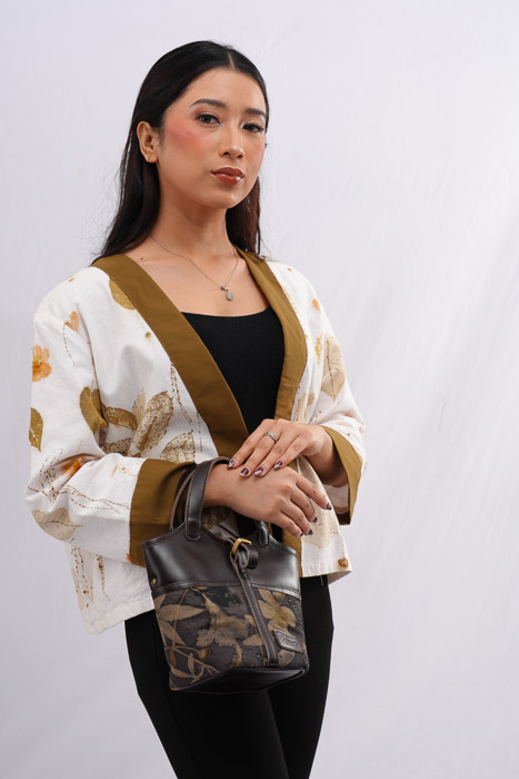 handbag with a unique design, a combination of denim fabric patterned with ecoprint techniques and cow leather