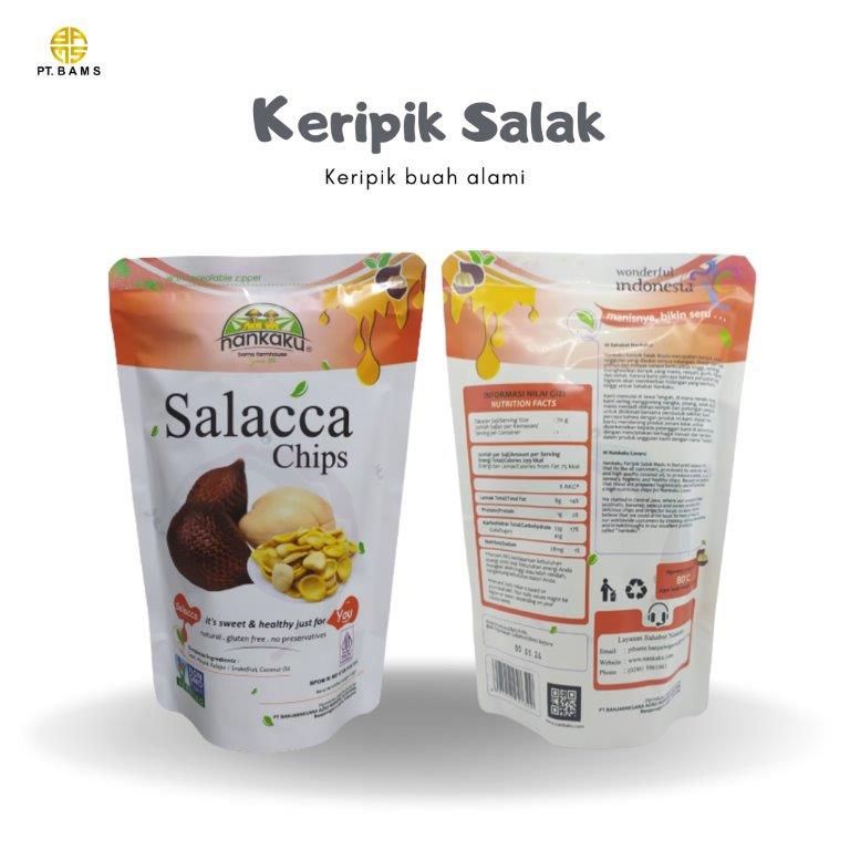 Nankaku Salacca Chips is one of the chips that is processed from Selected Salacca and coconut oil which produces sweet, crunchy, tasty, hygienic and healthy chips.
