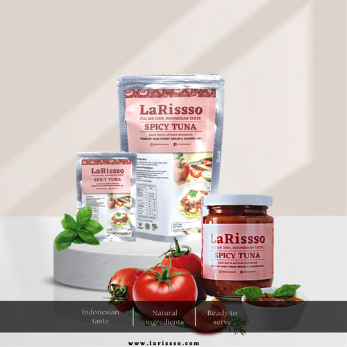 LaRissso Pasta Sauce Spicy Tuna variant is a spicy pasta sauce made from natural ingredients, namely fresh tomatoes harvested directly from the farmers, plus tuna fish flakes, cooked using canola oil and selected spices, and also a blend of Italian herbs. and local spices to create a unique pasta sauce that is slightly sour, fresh, savory and also spicy. In addition to pasta, this sauce is also suitable for spreading bread, pizza, dipping french fries, nachos, and even as a seasoning for fried rice.