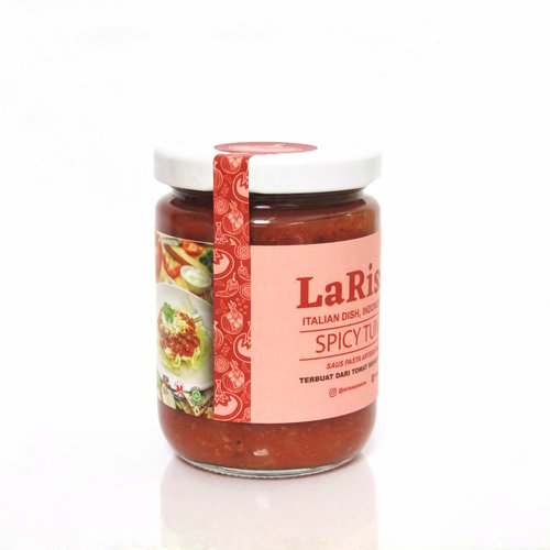 LaRissso Pasta Sauce Spicy Tuna variant is a spicy pasta sauce made from natural ingredients, namely fresh tomatoes harvested directly from the farmers, plus tuna fish flakes, cooked using canola oil and selected spices, and also a blend of Italian herbs. and local spices to create a unique pasta sauce that is slightly sour, fresh, savory and also spicy. In addition to pasta, this sauce is also suitable for spreading bread, pizza, dipping french fries, nachos, and even as a seasoning for fried rice.