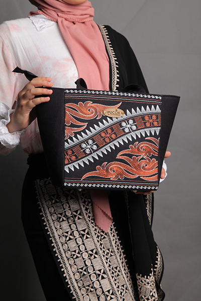 Motif Canek awan dan motif tapak Liman dengan inspirasi dari gelombang stunami di padukan dengan warna yg menarik membuat tas ladies awan tampil elegant .