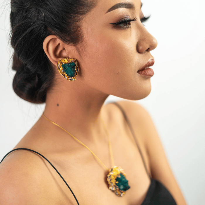 Bold, assertive, and captivating! This defines the Athena set from Puspa Mega Silver. Featuring turquoise-colored Turquoise stone, a non-translucent mineral cherished for its unique hue, it is framed with silver material accented with hollowed-out gold plating, resembling limestone to impart a strong impression on the wearer.