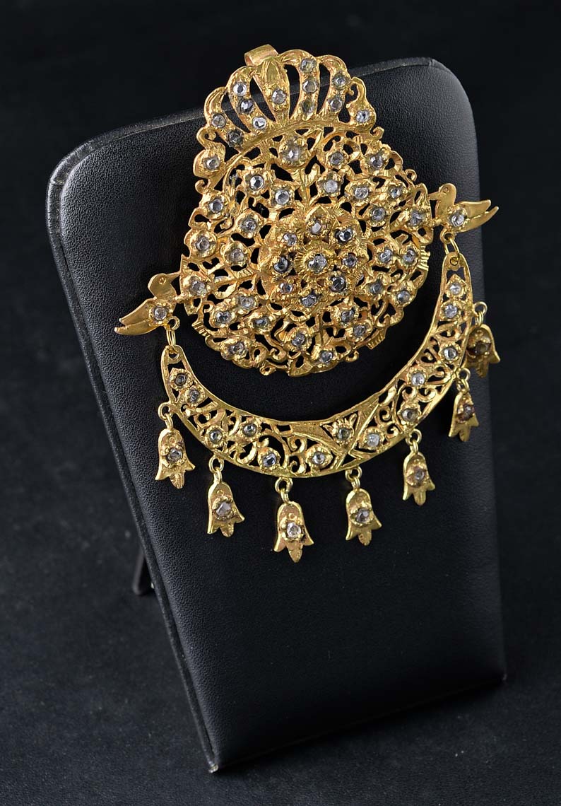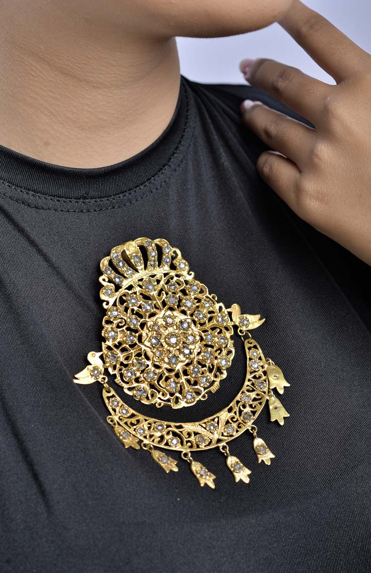 BROS BULAN IS A BROOCH MADE FROM GOLD COATED COPPER, A REPLICA OF A SPECIAL HERITAGE BROS IN PALEMBANG USING INTAN LEATHER JEWMS WHICH IS INSTALLATION PROCESS USING THE HANDMADE INSTALLATION METHOD