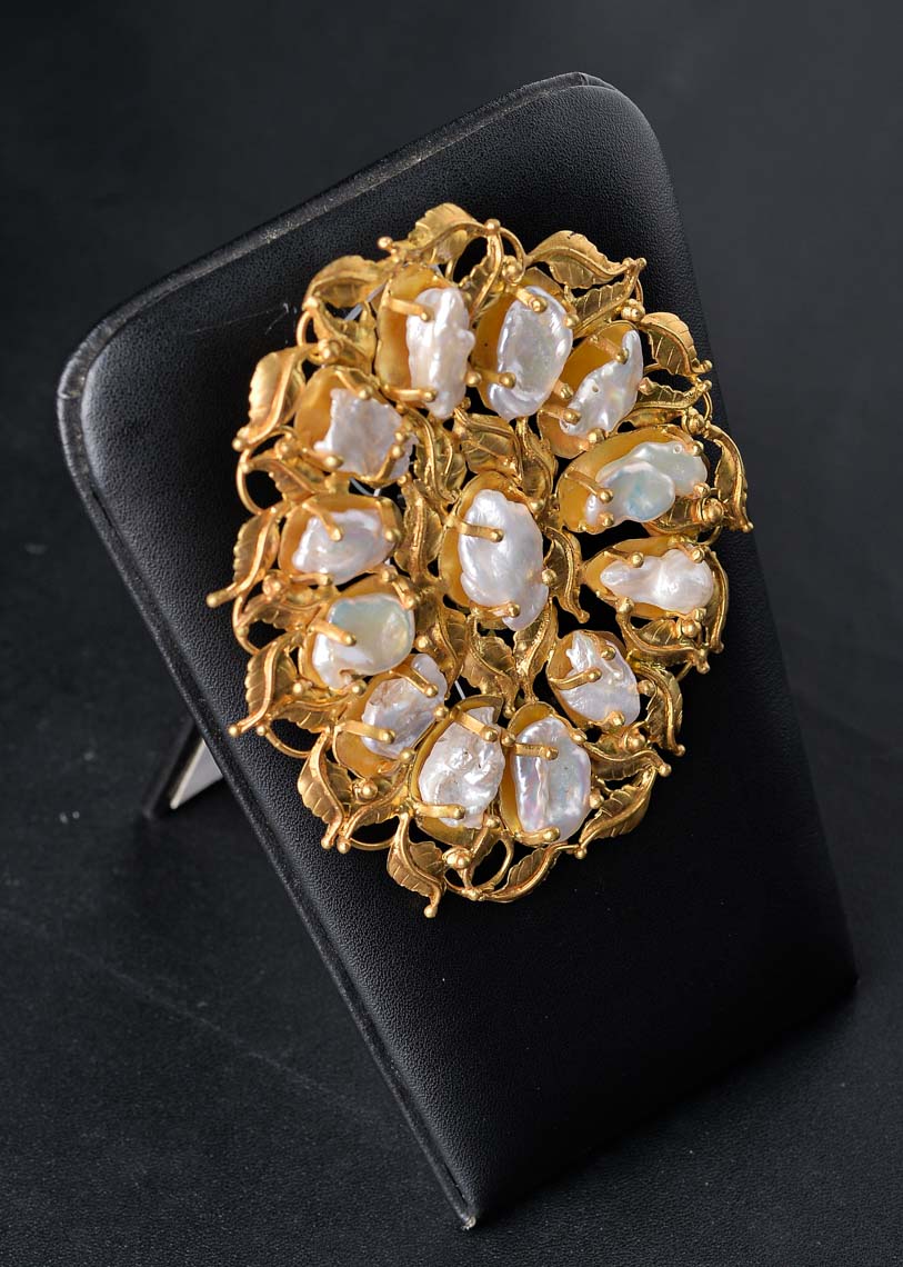 THE OVAL MAHARANI BROS HAS AN OVAL SHAPE USING A UNIQUE KHESI BAROK PEARL