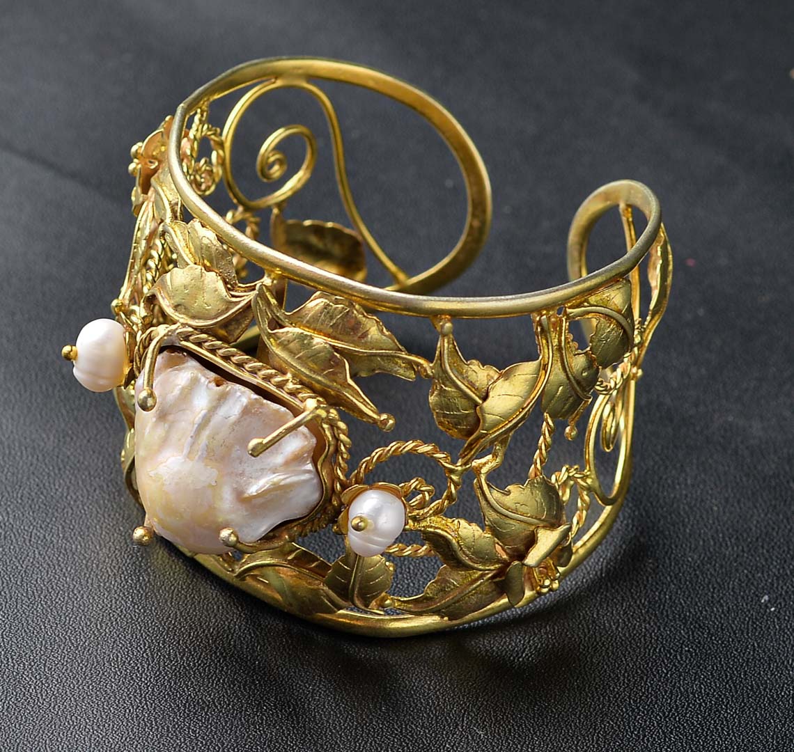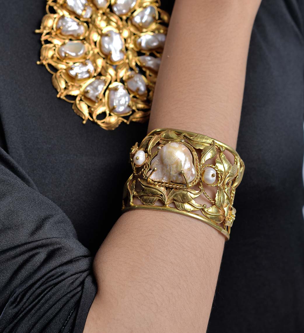 MAHARANI BRACELET SURROUNDED WITH JASMINE LEAF MOTIF MADE FROM GOLD-PLATED COPPER, THE ADDITION OF BAROK PEARL ADD A UNIQUE AND LUXURIOUS IMPRESSION