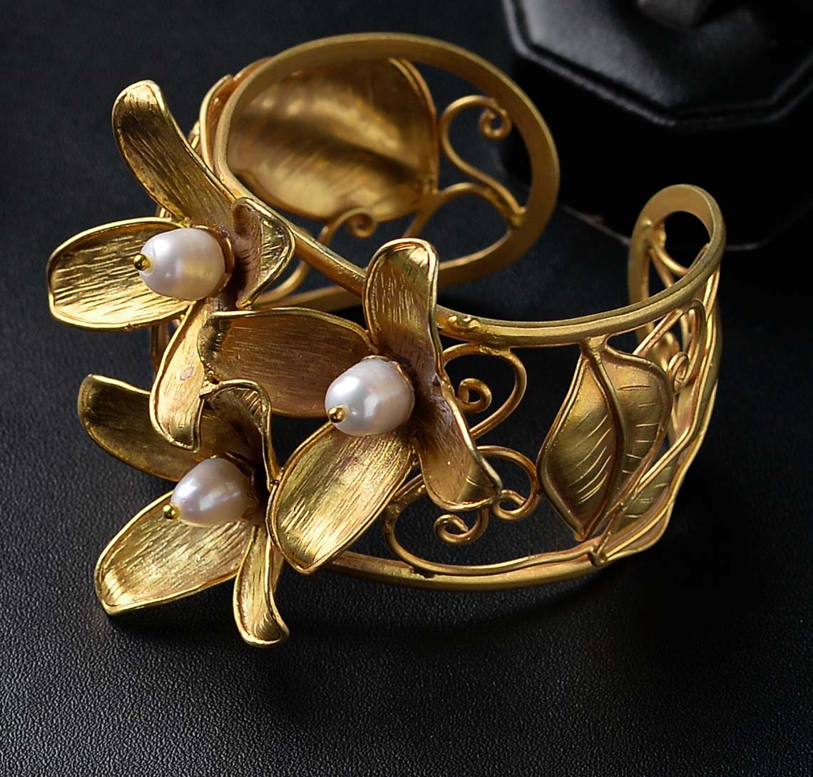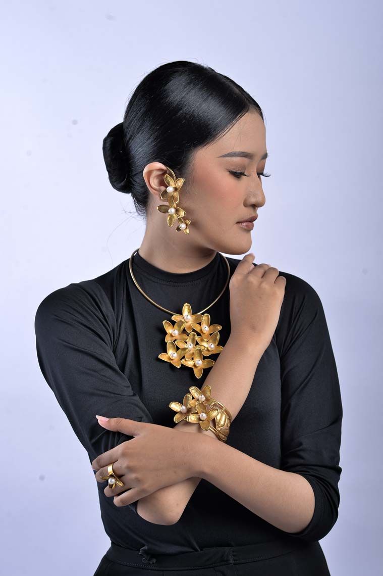Gelang kemuning has a shape resembling a yellow flower decorated with freshwater pearls, the bracelet is filled with jasmine flower motifs.