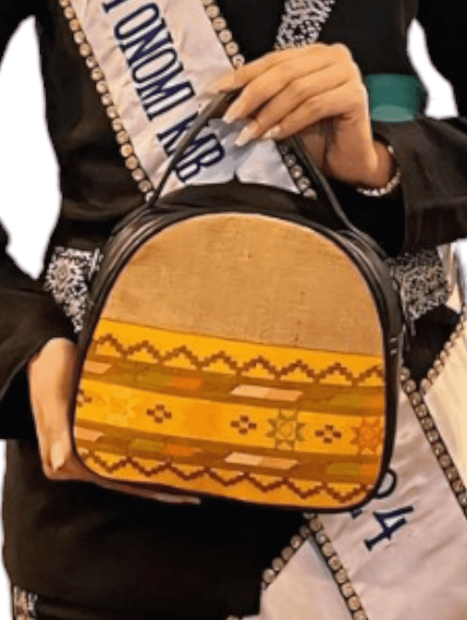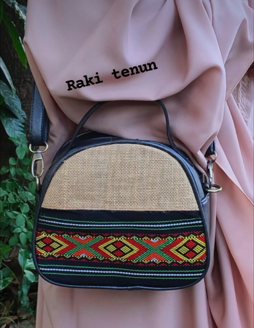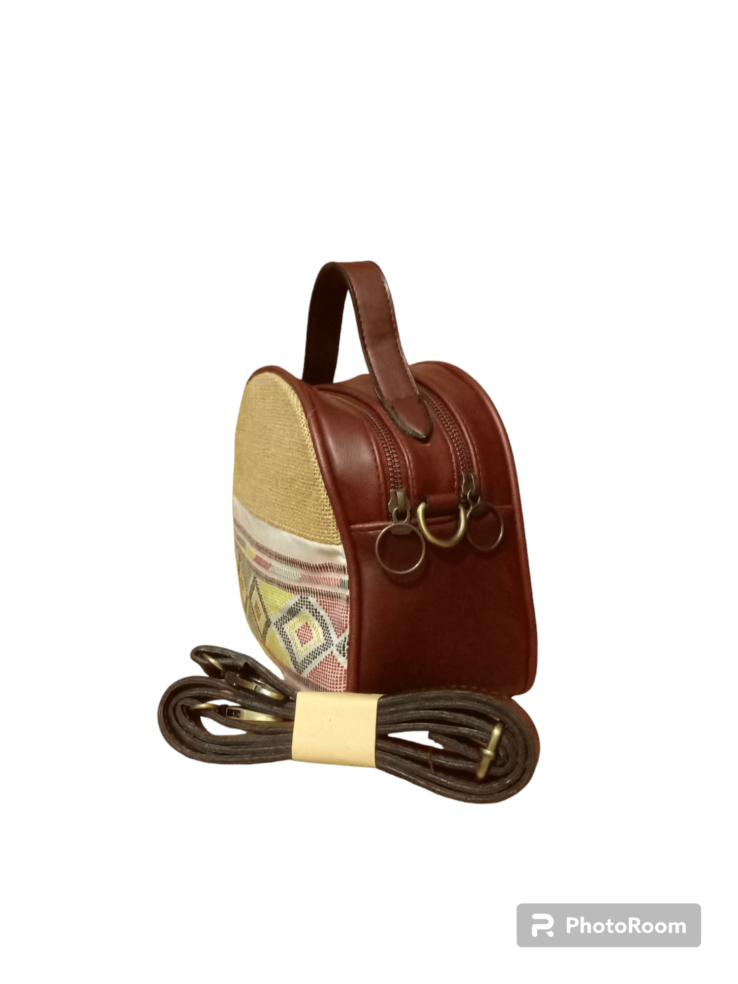 Round shaped women's bag with a woven base material mixed with synthetic leather with 2 compartments equipped with a YKK zipper and a long strap that can be disassembled.