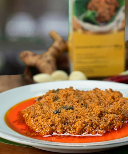 Material Content: Santan, Minyak Goreng, Cabai Merah, Bawang Merah, Serai, Jahe, Bawang Putih, Lengkuas, Kunyit, Daun Kunyit, Daun Jeruk Purut, Ketumbar, Pala, Bunga Lawang, Merica, Garam (Coconut milk, cooking oil, red chili, shallots, lemongrass, ginger, garlic, galangal, turmeric, turmeric leaves, kaffir lime leaves, coriander, nutmeg, bunga lawang, pepper, salt)
