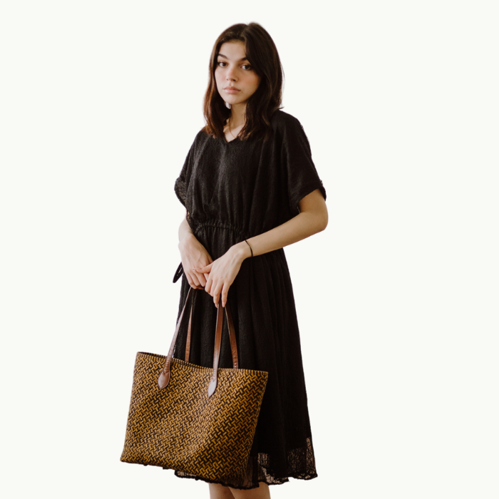 Lumbini mini is a tote bag made from woven lurik woven fabric, with genuine cowhide leather handles. On the inside using suede fabric, complete with two inner pockets and one zippered pocket. Can be used as a shoulder bag
