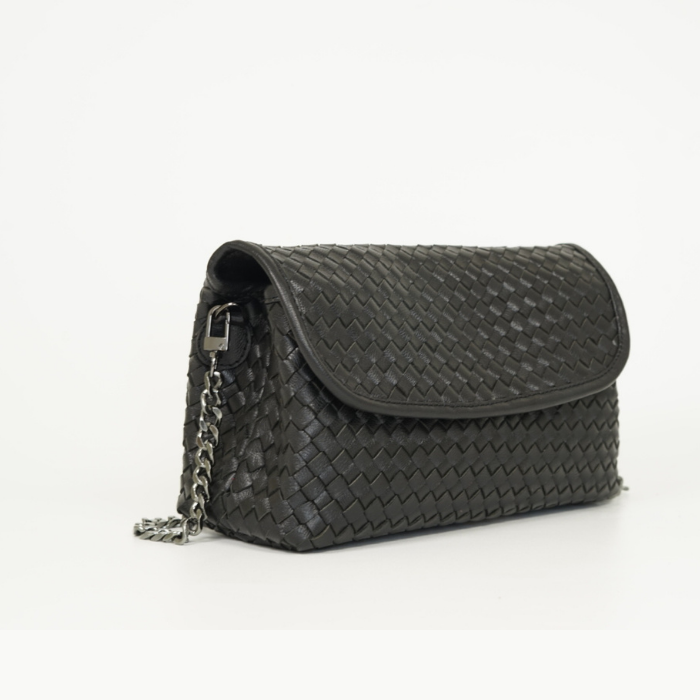 Clutch with all-over cowhide leather webbing on the front and back. Flip is accompanied by a locking latch. Interior lined in suede fabric, with an interior pocket. Can be styled as a sling bag with the long detachable chain strap.