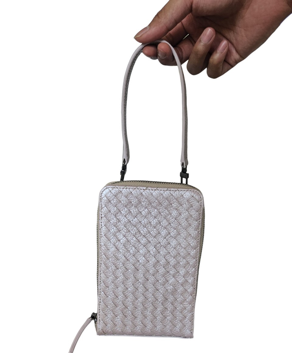 Rukmini bag, made genuine cowhide leather with woven part on the front and zipper as closure. The interior part is lined suede fabric, with a slip for cell phone and passport, and four card pockets. Pretty phone's hand bag for women with a detachable leather strap.