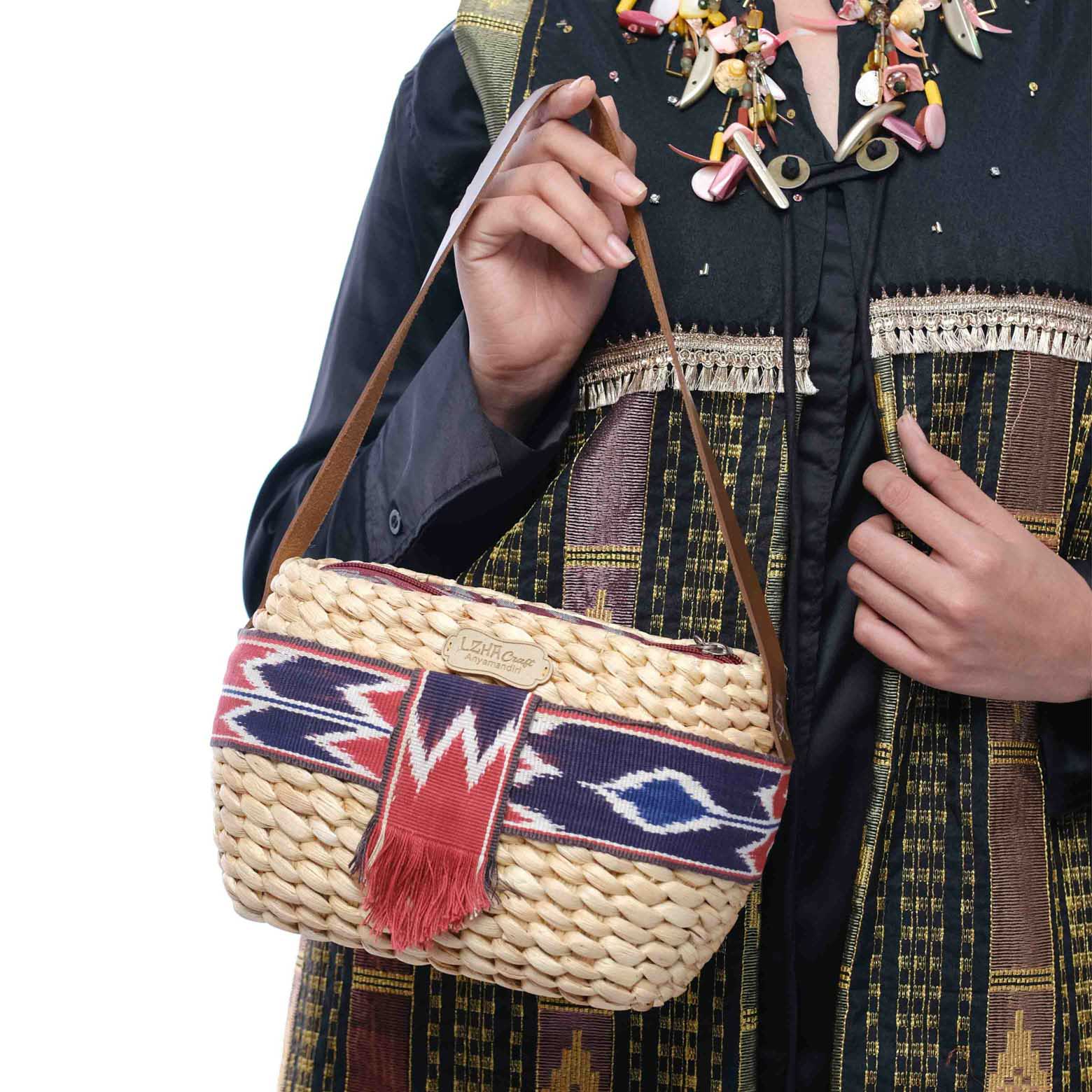 A woven bag made from water hyacinth with a variety of woven fabrics. The variation of the tossok bale woven motif means to resolve the failures