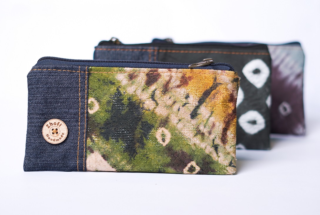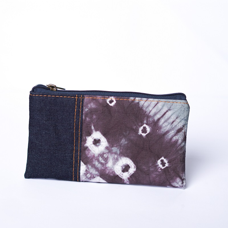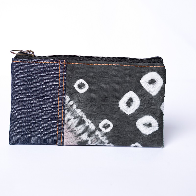 A pouch that can be used for cellphones and writing tools, which is made from jeans and jumputan fabric