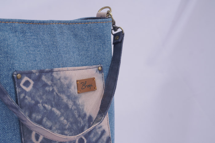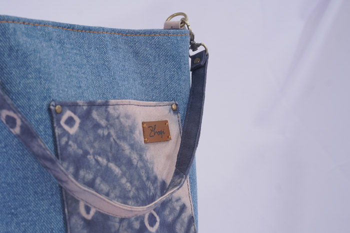 The body of this bag is made of light blue jeans, with a pocket application on the front using Palembang jumputan fabric.
