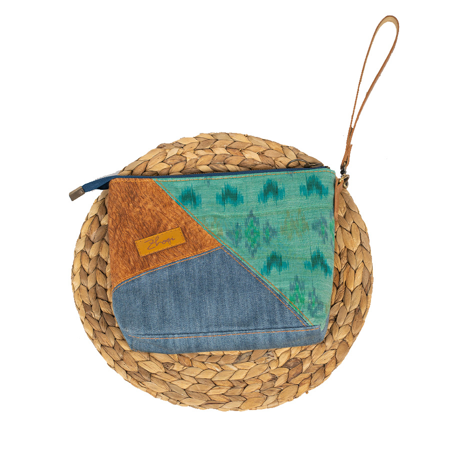 Terbuat dari paduan kain jumputan, bahan jeans warna biru muda dan kulit kayu, bagian dalam terdapat kantong resleting. Dilengkapi dengan handel tangan terbuat dari kulit sintetis premium