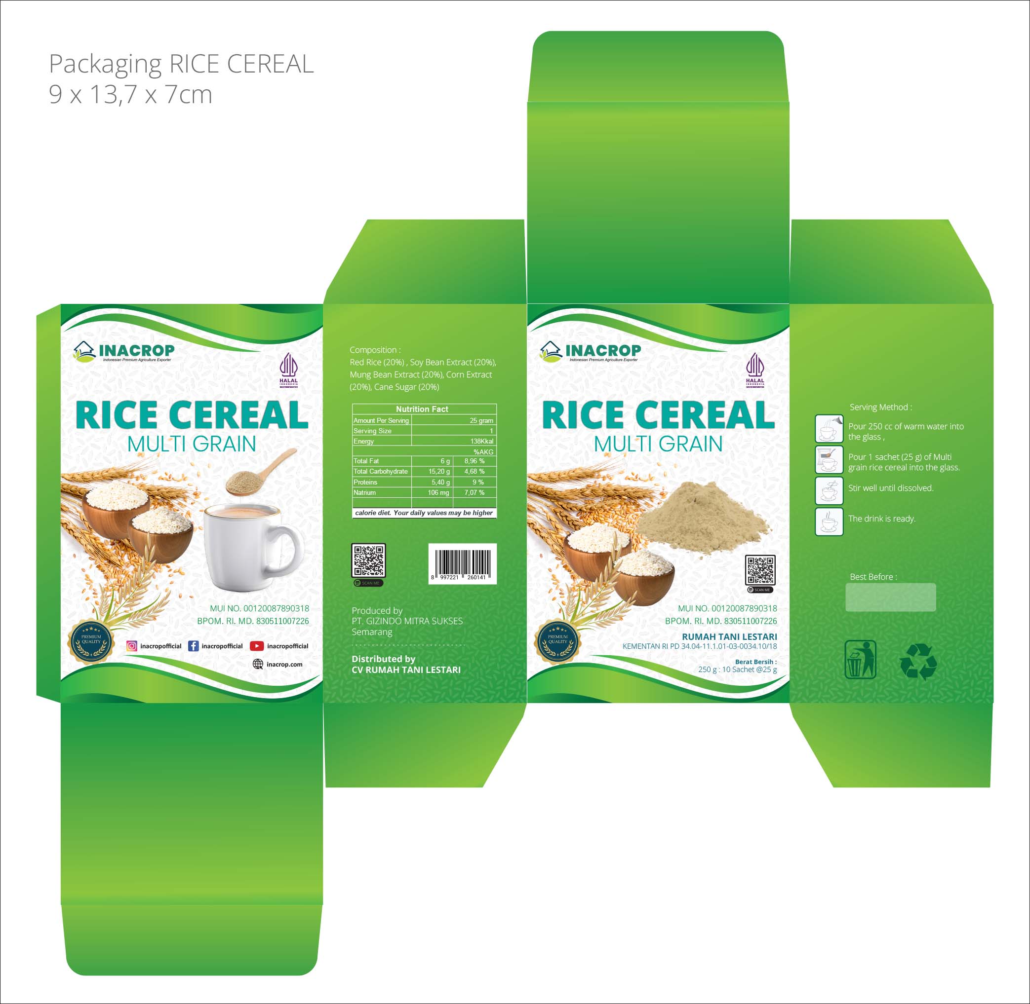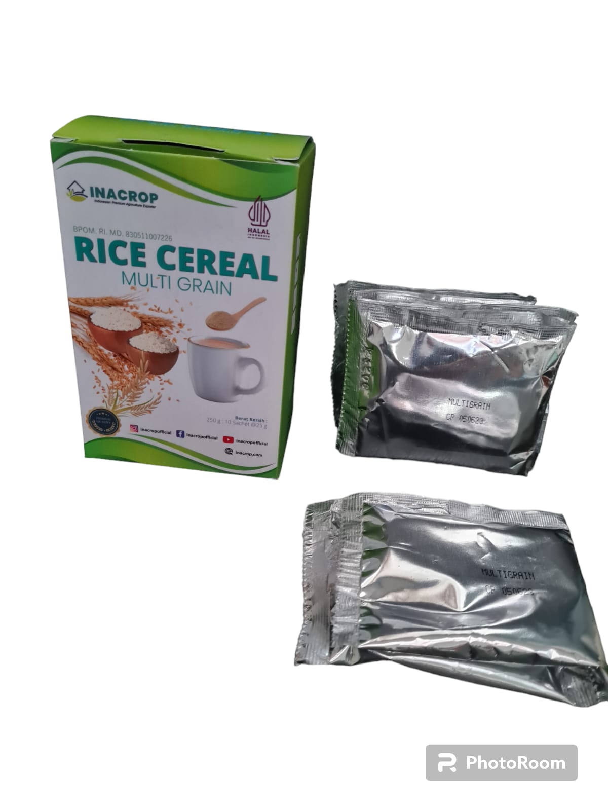 - Multigrain Cereal: Powder drink made of organic red rice which mixed with mung bean, soybean, corn and cane sugar. Soybean contain high levels of vegetable protein, as a substitute for animal protein. There are 3 variants of multigrain cereals; (sweet), less sugar, sugar free or no sugar.