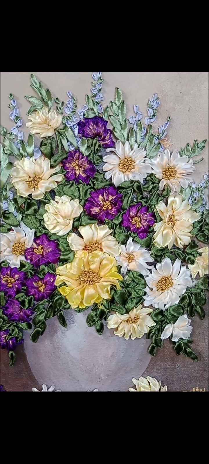 A combination of acrylic painting and ribbon embroidery on canvas.