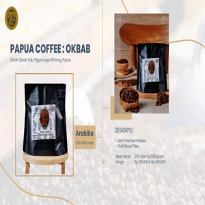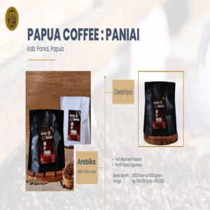 Biji kopi asli dari kawasan pegunungan timur Papua, yakni dari kampung Maksum, Distrik Okbab, Kabupaten Pegunungan Bintang. Diawali dengan memberikan edukasi berkelanjutan kepada kelompok petani kopi setempat, seperti pengetahuan mengenai mengenai penanaman kopi, perawanan tananamannya serta penanganan paska panen biji kopi, diharapkan dapat menghasilkan biji kopi dengan kualitas terbaik dan citrarasa yang unik. Kopi dari Kabupaten Paniai saat ini sedang kami kembangkan dan tentunya dengan terus membina petani kopi setempat.