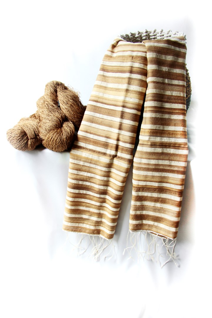tampak pada tenunan selendang yang mengombinasikan benang dari kepompong tiga spesies. Rona putih filamen Samia Cynthia Ricini yang hidup di pohon ketela dipertemukan dengan spektrum kecokelatan serat Attacus atlas dan benang lungsin kekuningan Bombyx mori. Terciptalah sutera berkilau sehalus dan seindah sayap kupukupu.