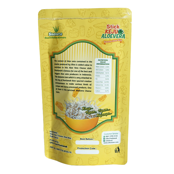 The Aloe vera content contained in the snack produced by Ulira is an added value for nutrition in this Aloe vera Cheese stick. Pontianak is famous as one of the best and largest aloe vera producers in Indonesia. The aloevera icon which is very closely related to the city of Pontianak then spurred creative entrepreneurs to make various kinds of unique and classy processed products. One of them is this delicious Aloevera Cheese Stick.