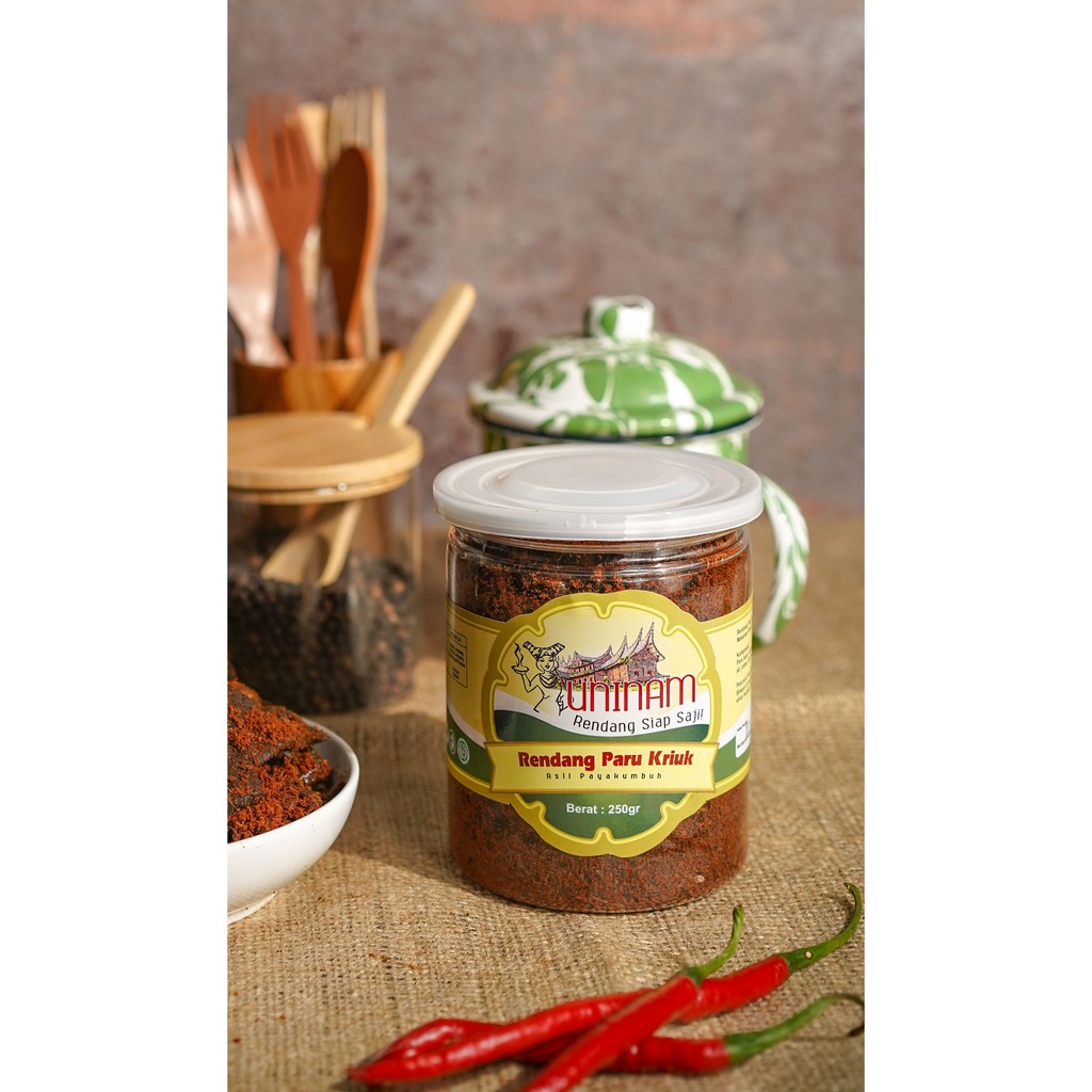 Rendang Paru Kriuk Uninam merupakan rendang yang berbahan Paru Sapi Pilihan yang dibudayakan oleh masyarakat lokal, lalu di olah menjadi rendang kemasan. Rasakan sensai unik dari kelazatan Rendang Paru Kriuk Uninam