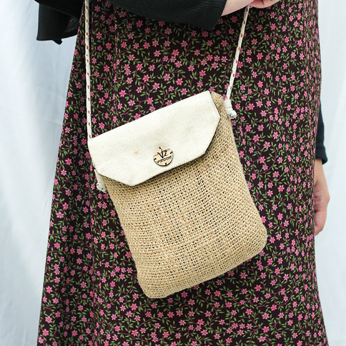Slingbag made from jute sack waste as the main material combined with canvas. Equipped with lining and a magnetic closure.