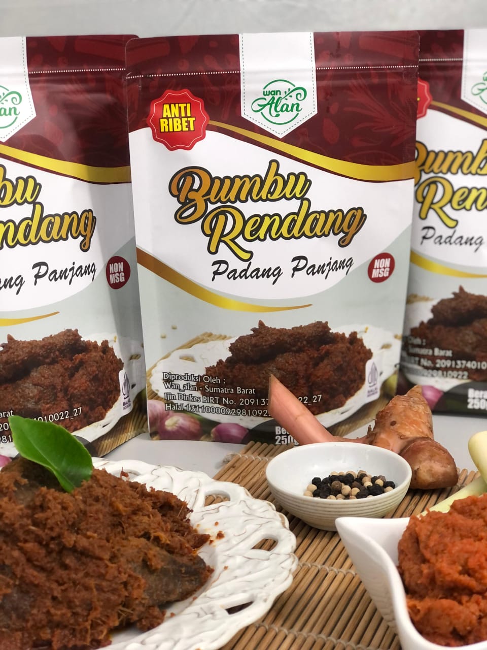 The rendang seasoning Wan Alan is meticulously prepared hygienically, using local spices and ingredients sourced directly from farmers, ensuring the authenticity of the rendang seasoning is strongly felt. It is packaged using vacuum packaging, heat-resistant, and sterilized at high temperatures, making it long-lasting without the need for chemical preservatives.