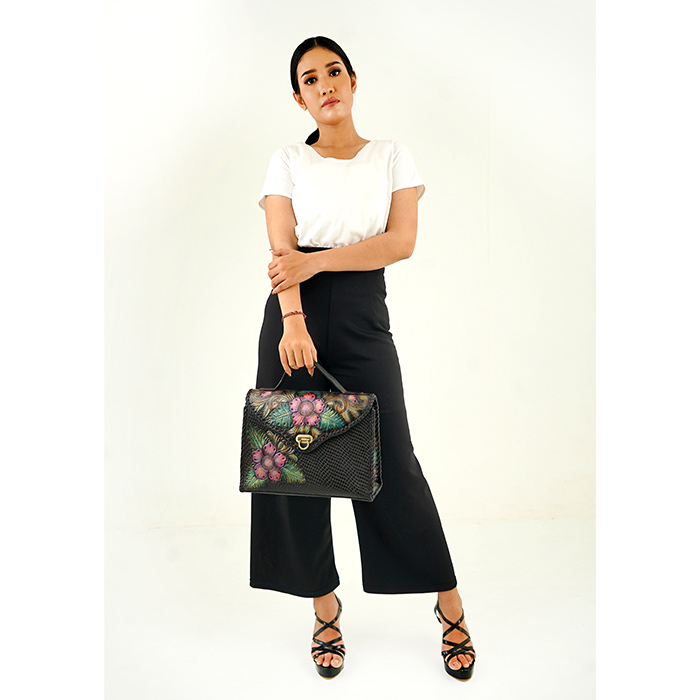 Patra Hibiscus Flowers, Patra bun-bunan or vines with a repeating pattern between leaves and Hibiscus Flowers which symbolizes Purity, Beauty and Elegance. Combined with Python Snake Scale Motif Cow Skin