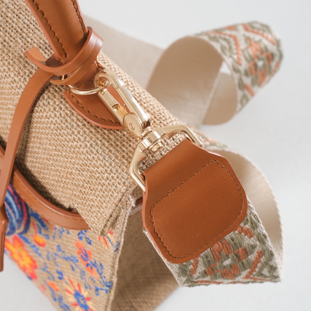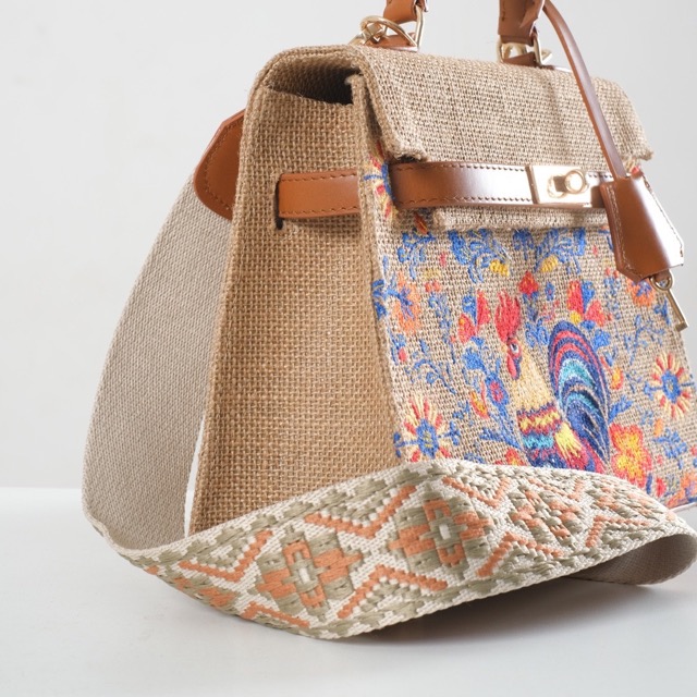 Meaning: Burlap is an eco-friendly alternative for bags due to its sturdy, durable nature and natural appearance. Combined with rooster embroidery, it symbolizes hard work and represents the spirit of a fighter and a prosperous family.
