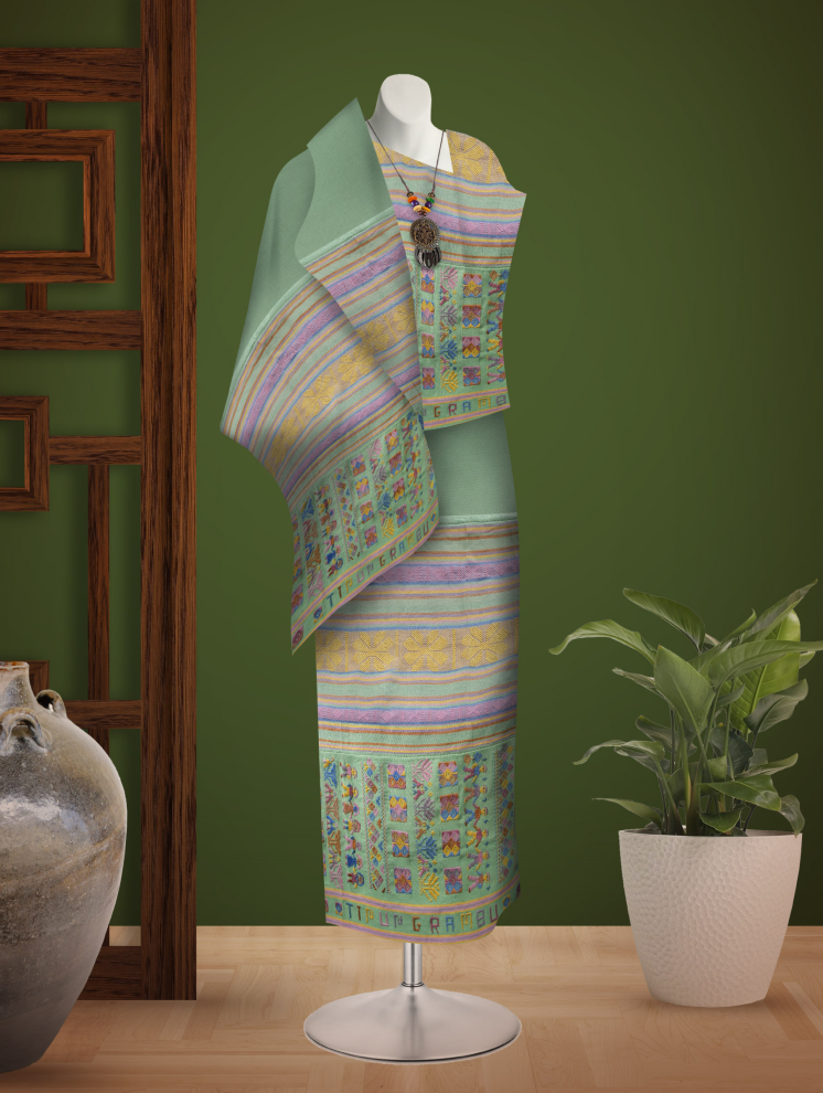 Tais (Sarung) Talik Ema Mandeu ini merupakan sarung yang terdiri dari 3 panel yang dikerjakan menggunakan benang 32/2 serta melalui proses pewarnaan alami. Sarung ini menggunakan 2 teknik pekerjaan tenun yang umumnya ditemukan di Pulau Timor, yaitu teknik songket (sotis) pada bagian tengah, teknik buna (talik) pada bagian bawah serta tenun polos pada bagian atas. Pewarnaan alami di dalam sarung ini menggunakan beberapa jenis tanaman dan bagiannya seperti bawang hutan (pink), daun suji dan daun gala-gala (hijau), kunyit dan kayu kuning (kuning), daun nila (biru), pucuk jati muda (ungu), akar mengkudu (merah bata) dan mahoni (cokelat). Motif yang digunakan pada tais ini merupakan gabungan motif asli dan motif kontemporer terutama pada bagian buna. Pada bagian sotis menggunakan motif bunga sepe yang umumnya ditemukan di Pulau Timor dan mekar saat musim penghujan. Pada bagian buna, terdapat beberapa motif kontemporer yang menggambarkan alam dan manusia yang saling tolong-menolong. Manusia bergandengan menjadi lambang kesatuan yang dipelihara sejak kecil dan dekat dengan alam sekitarnya yang digambarkan dengan motif pepohonan dan burung, serta sarang burung. Pada bagian bawah, sarung ditenun dengan motif tulis yang dapat diganti dengan ragam kalimat atau hal bijak lainnya. Harapannya, melalui tais ini, penggunanya diingatkan untuk bisa saling berempati dengan sesama dan menjaga lingkungan sebaik mungkin.