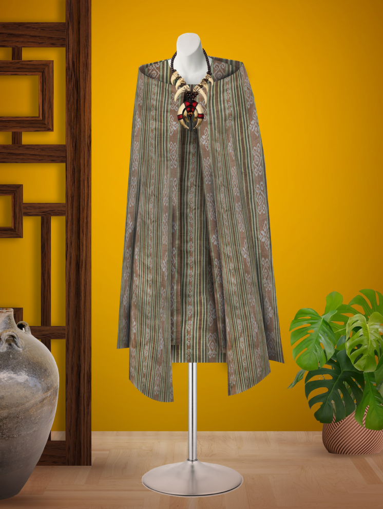Tenun Kaltara D’utan dengan teknik pewarnaan alam dan menampilkan Motif Kujau. Motif ini terinspirasi dari tumbuhan kujau (sejenis Pakis) yang banyak tumbuh di hutan Kalimantan Utara. Bentuknya simetrikal mengibaratkan makna keseimbangan, kesetaraan dan keakraban. Warna-warna alam bermaksna harapan, mimpi dan kebijaksanaan leluhur.