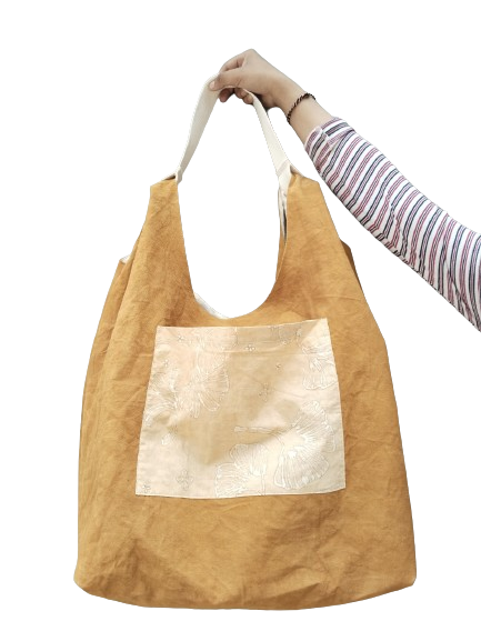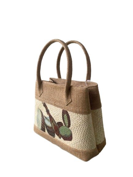 Jenis Bahan: Anyaman pandan kombinasi kain goni dengan motif dari tissue (Combination of pandan weaving with burlap fabric and motif from tissue)