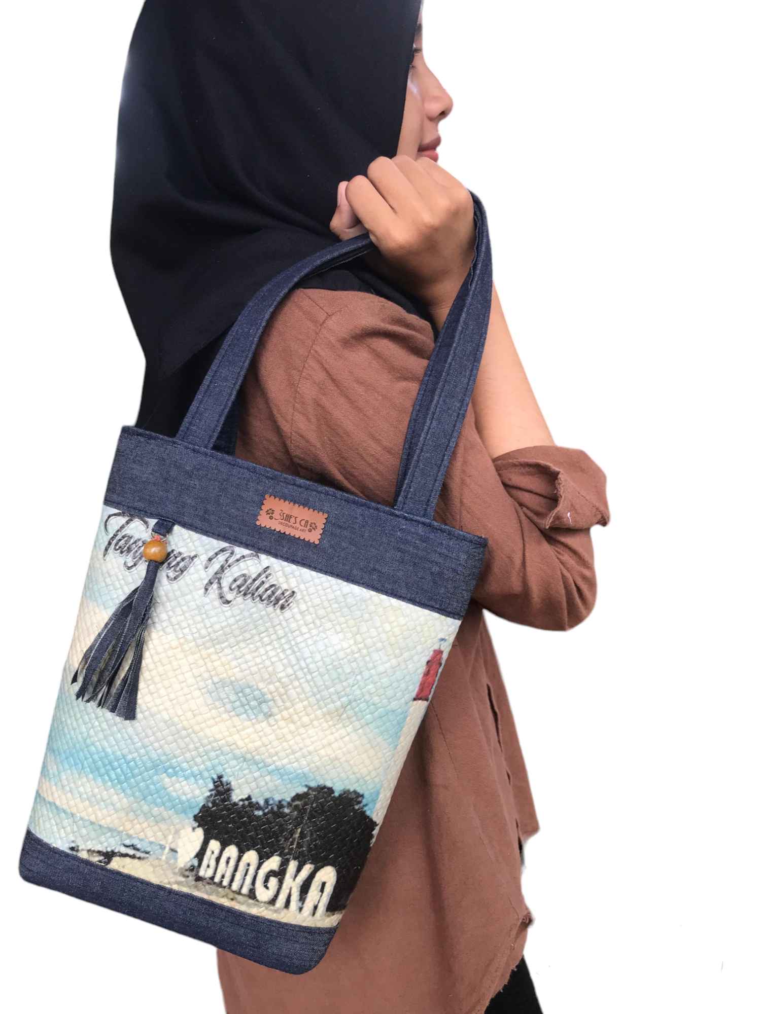 - Tas ini merupakan hasil dari kreasi decoupage dengan keunikan di motifnya yang berasal dari tissue bermotif di atas media anyaman pandan. Inovasi kami di tas ini adalah menggunakan tissue dengan motif kearifan local khas Bangka Belitung yaitu Mercu Suar di Pantai Tanjung Kalian. Tas ini ini dikombinasikan dengan bahan jeans dan memiliki ukuran yang sedang dengan dilengkapi resleting. Stok tersedia dan bisa dipesan dalam jumlah banyak dengan sistem PO. Serta bisa juga costum untuk motifnya.