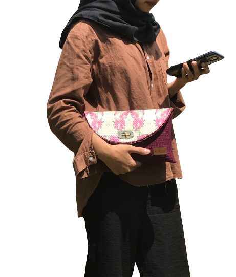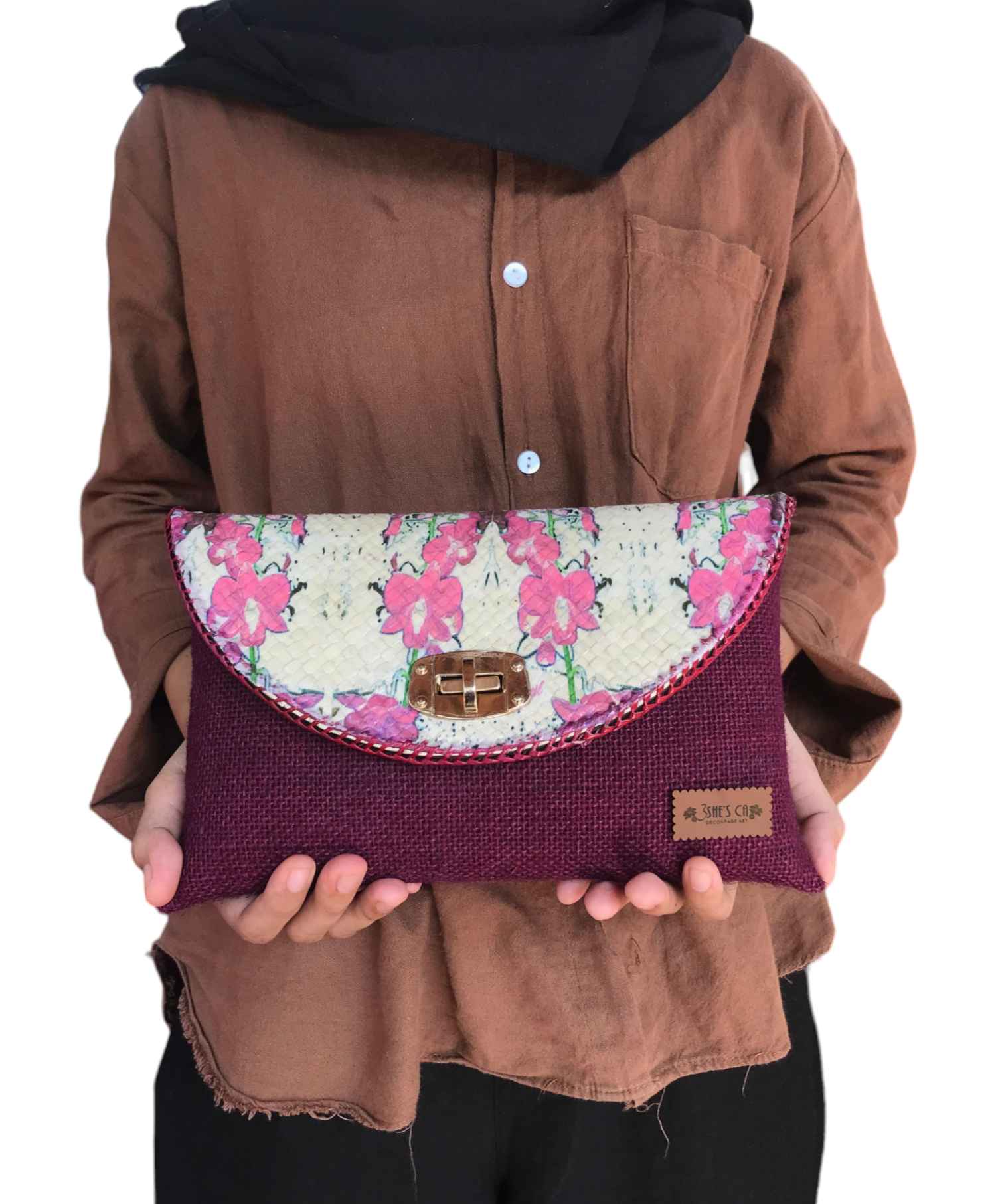 - Clutch ini merupakan hasil dari kreasi decoupage dengan keunikan di motifnya yang berasal dari tissue bermotif di atas media anyaman pandan dengan kombinasi bahan goni. Inovasi kami di tas ini adalah menggunakan tissue dengan motif kearifan local khas Bangka Belitung yaitu bunga yang pernah dibudidayakan di Bangka Belitung, Anggrek Pensil. Clutch ini memiliki ukuran yang sedang dengan dilengkapi tali panjang rantai. Stok tersedia dan bisa dipesan dalam jumlah banyak dengan sistem PO. Serta bisa juga costum untuk motifnya.