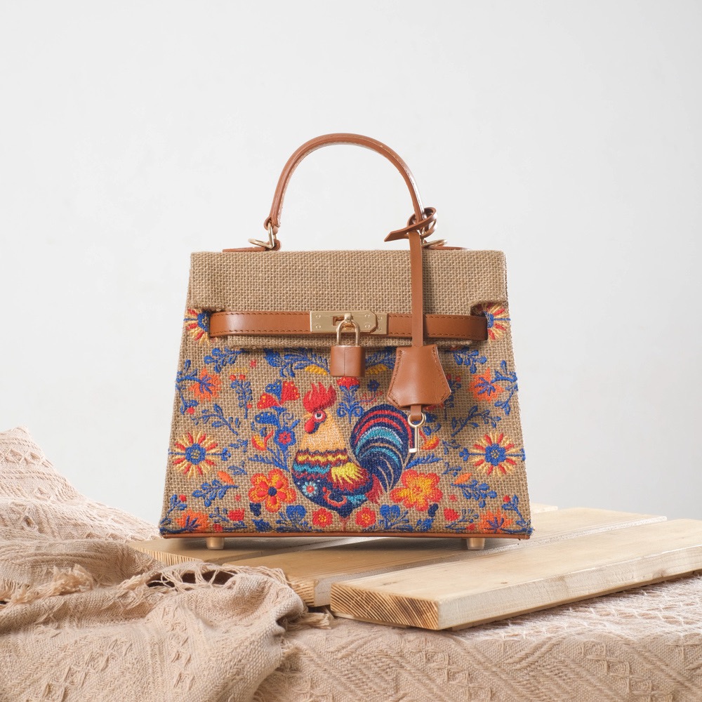Jenis Bahan: Anyaman pandan handle kayu dengan motif dari tissue (Pandan weaving with a wooden handle and motif from tissue)