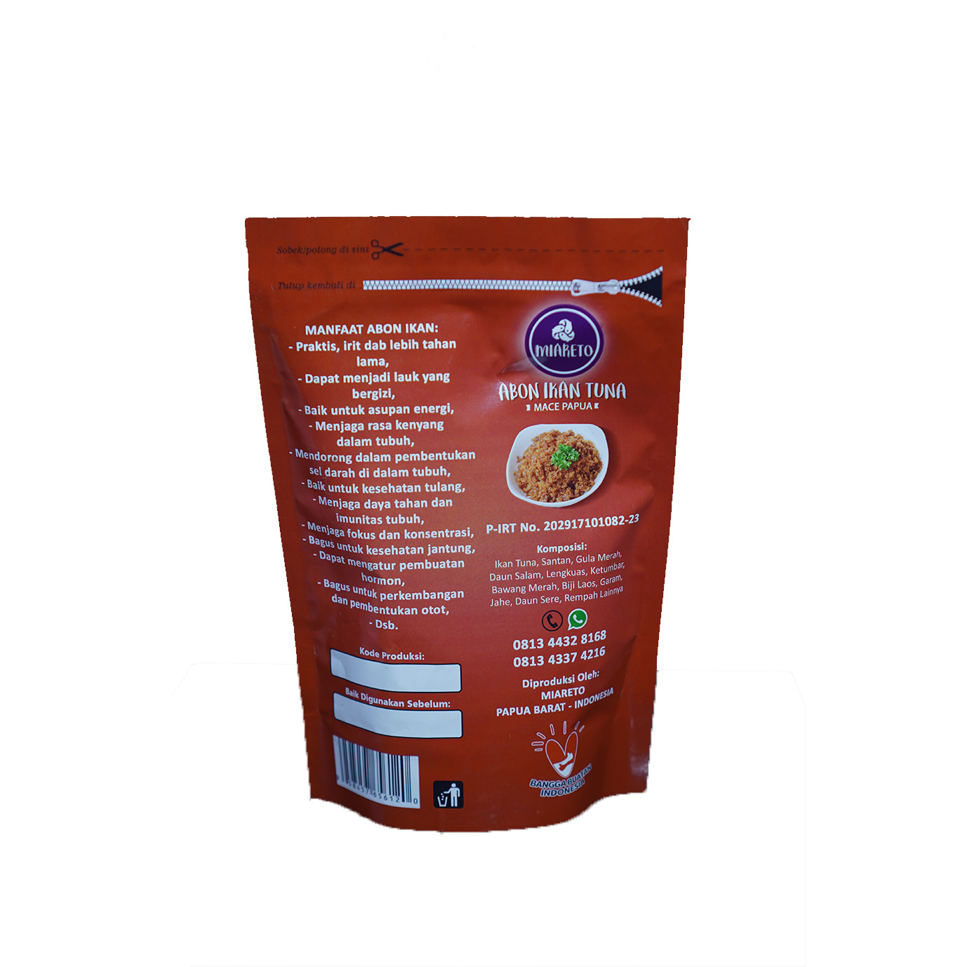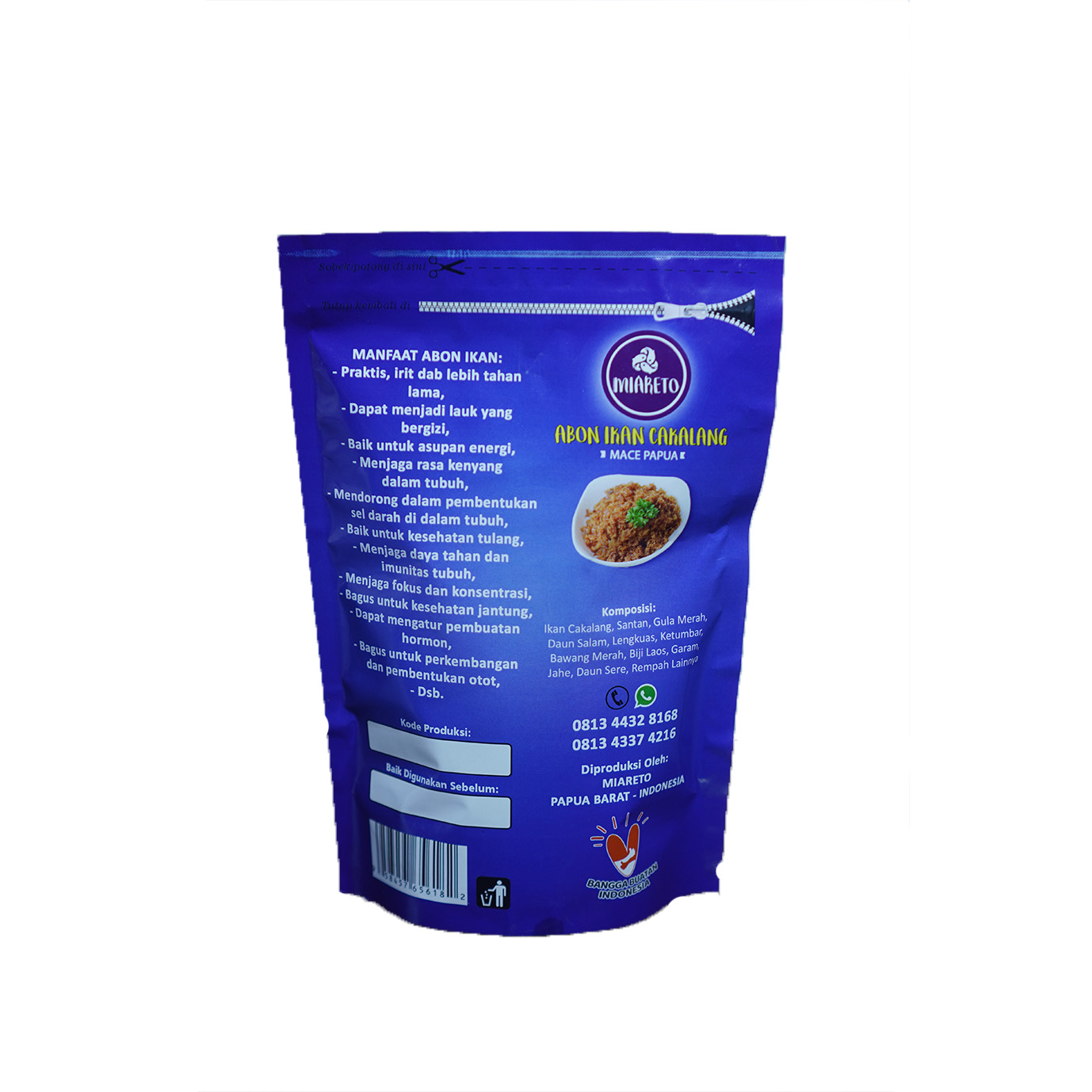 Produk abon yang berbahan dasar ikan laut yaitu tuna, cakalang dan tenggiri yang diolah menggunakan rempah-rempah pilihan. Kemudian dikemas menggunakan kemasan aluminium foil dan siapkan dipasarkan.