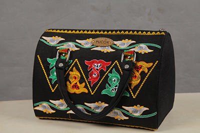Terbuat dari bahan tenun ikat, kulit sintetis premium, inner katun, aksesoris black nikel, resleting.