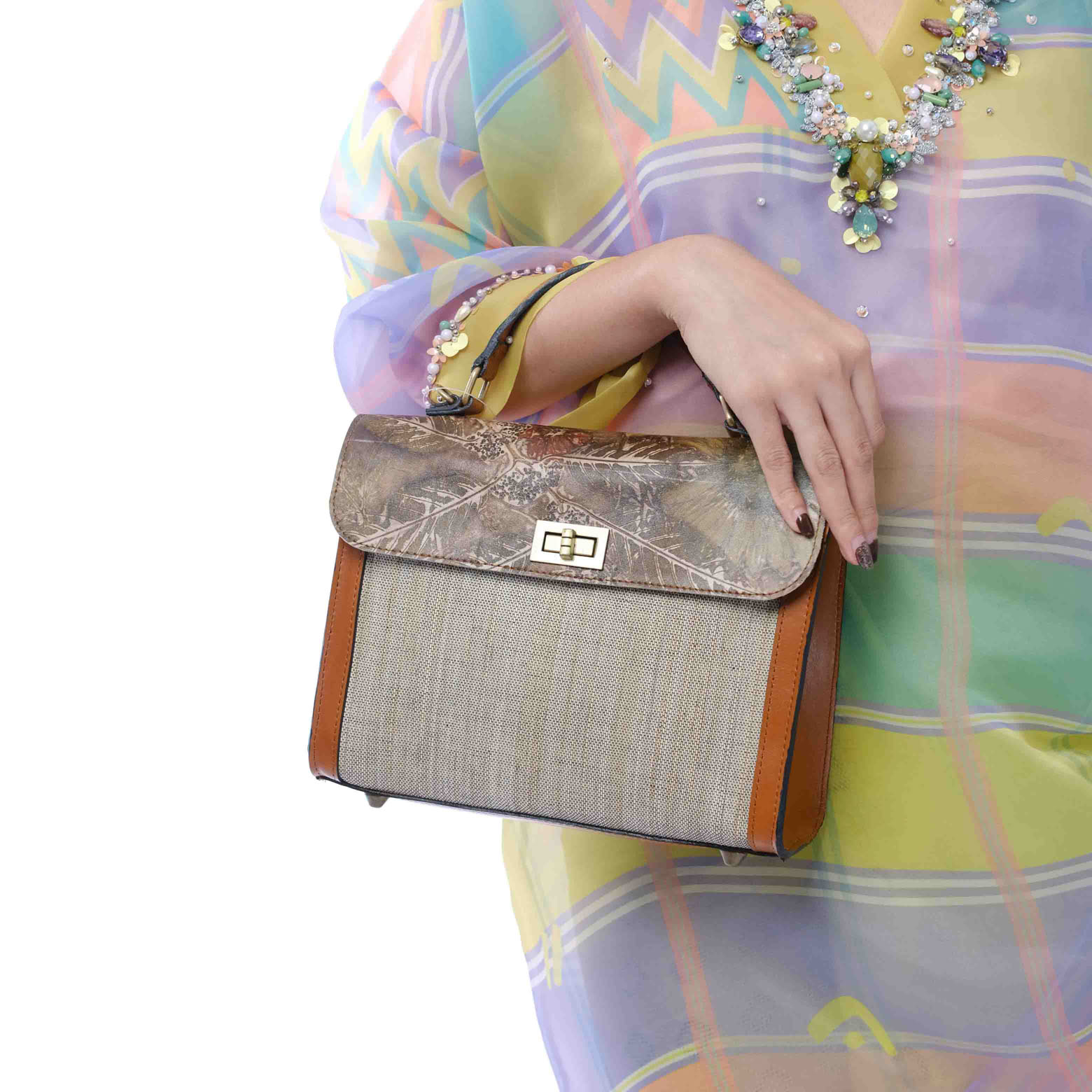Tas yang bahan dari tenunan serat lontar kombinasi dgn bahan kulit domba yg diekoprint. Dipakai untuk santai & formal.Bahan seratnya lembut,halus, kuat, ringan & diproses secara tradisional