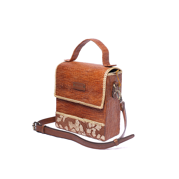 Berbahan dasar serat kulit kayu kapuak yang merupakan bahan Khas kearifan lokal Kalimantan dikombinasikan dengan kain ecoprin yang motif nya dihasilkan dari daun-daun yang segar.
